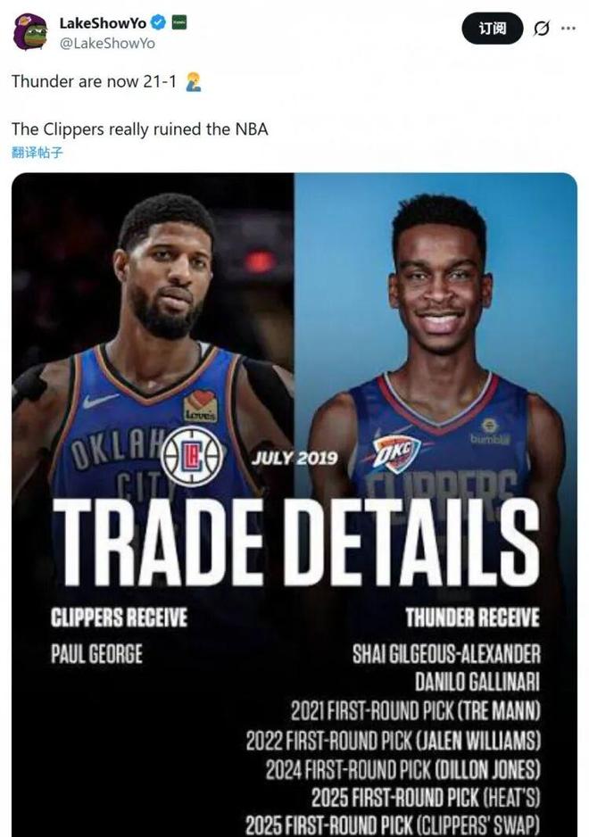 湖人自媒體LakeShowYo對此寫道:“雷霆現(xiàn)在21勝1負(fù),快船毀了聯(lián)盟。”